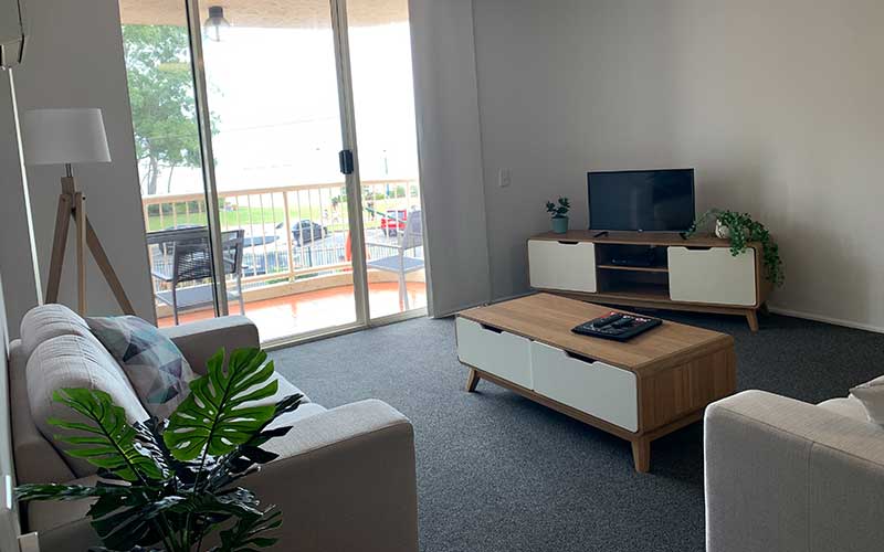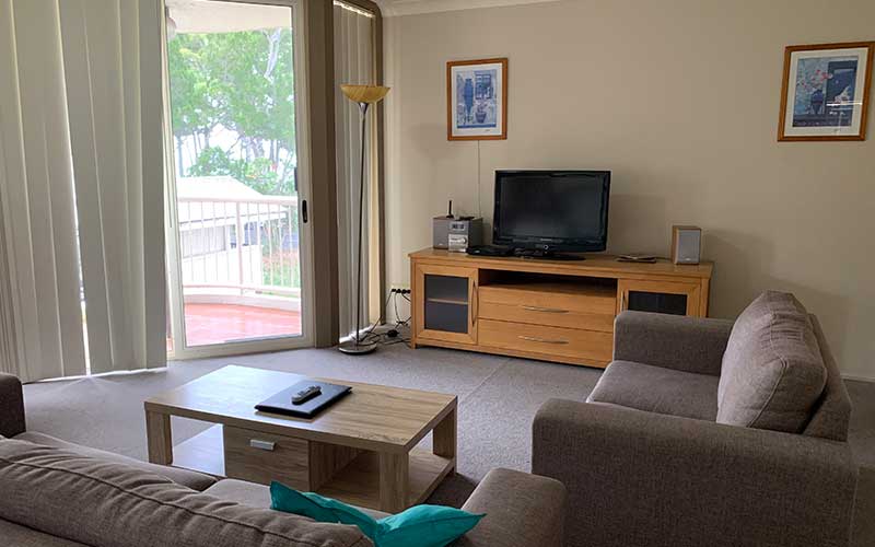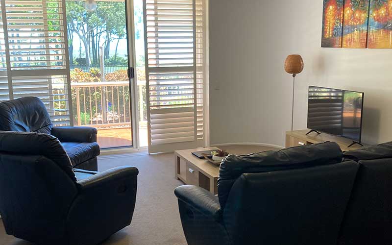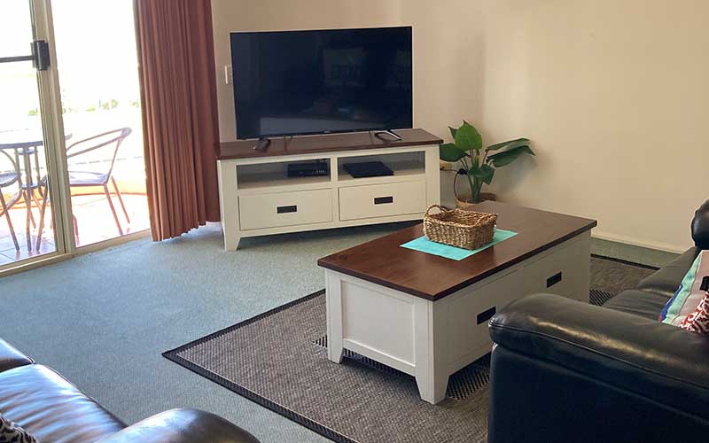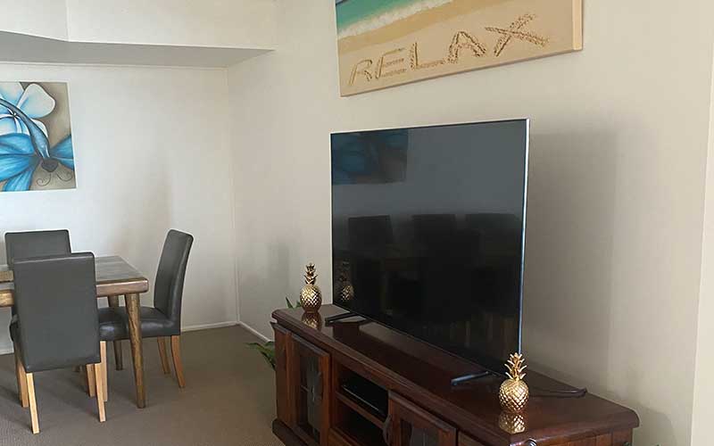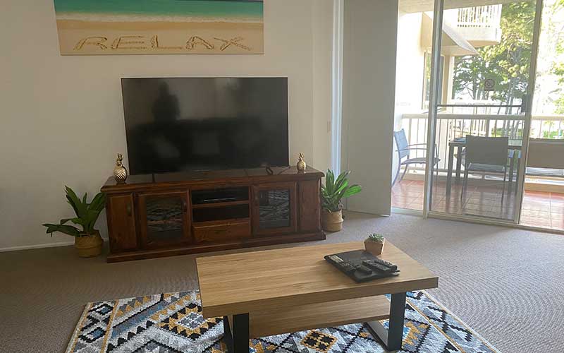 With a large patio featuring outdoor dining and a sun chair for relaxation, the partly covered area is versatile and provides magnificent ocean views as well as a bird’s eye view of the salt water pool and the complex gardens – this apartment has it all! Both lounge room areas feature flat screen TV’s with the main lounge also featuring a blue-ray player. The main bedroom also features a flat screen TV.
