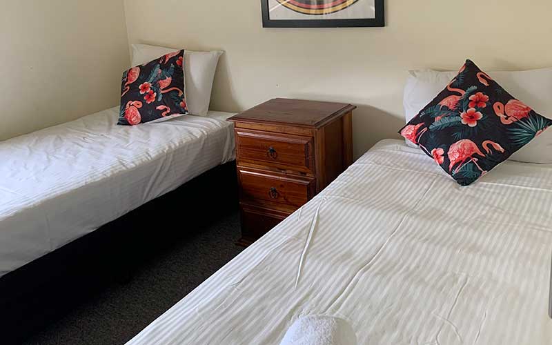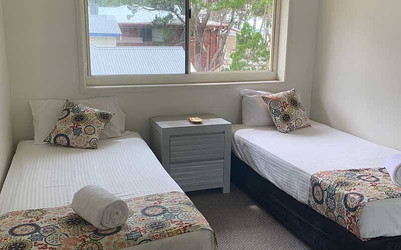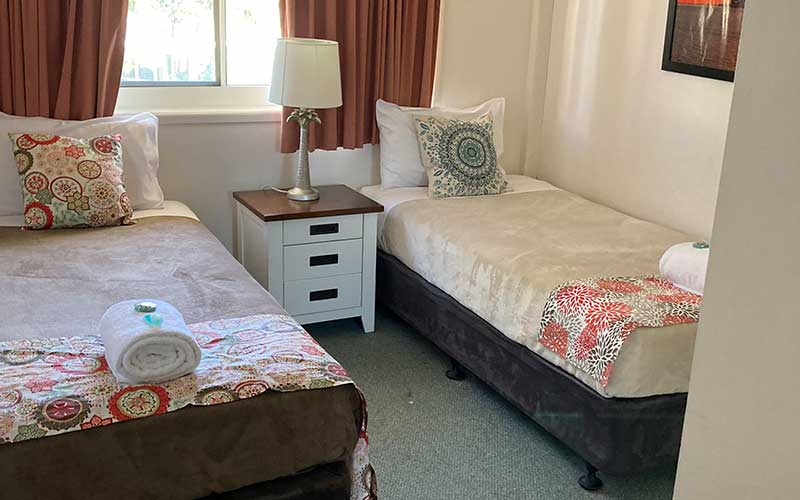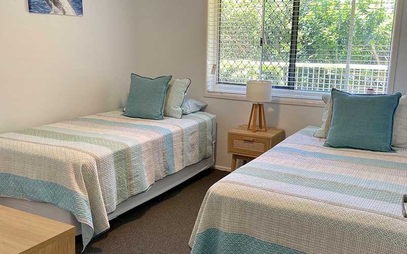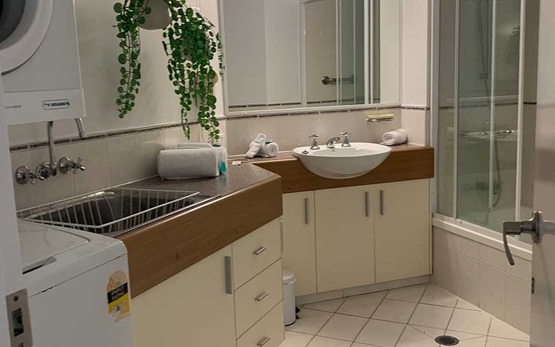 Either 1 queen bed or 2 single beds, single bathroom, in-room laundry
