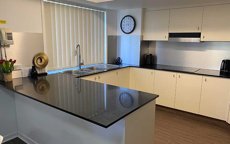 The apartment also features its own separate laundry, has an en-suite to the main bedroom and a second bedroom with a very large shower. The bedding configuration for the Penthouse is 2 queen beds and 2 single beds with extra guests able to utilise the double sofa bed located in the second lounge area. The entire apartment is wheelchair accessible.